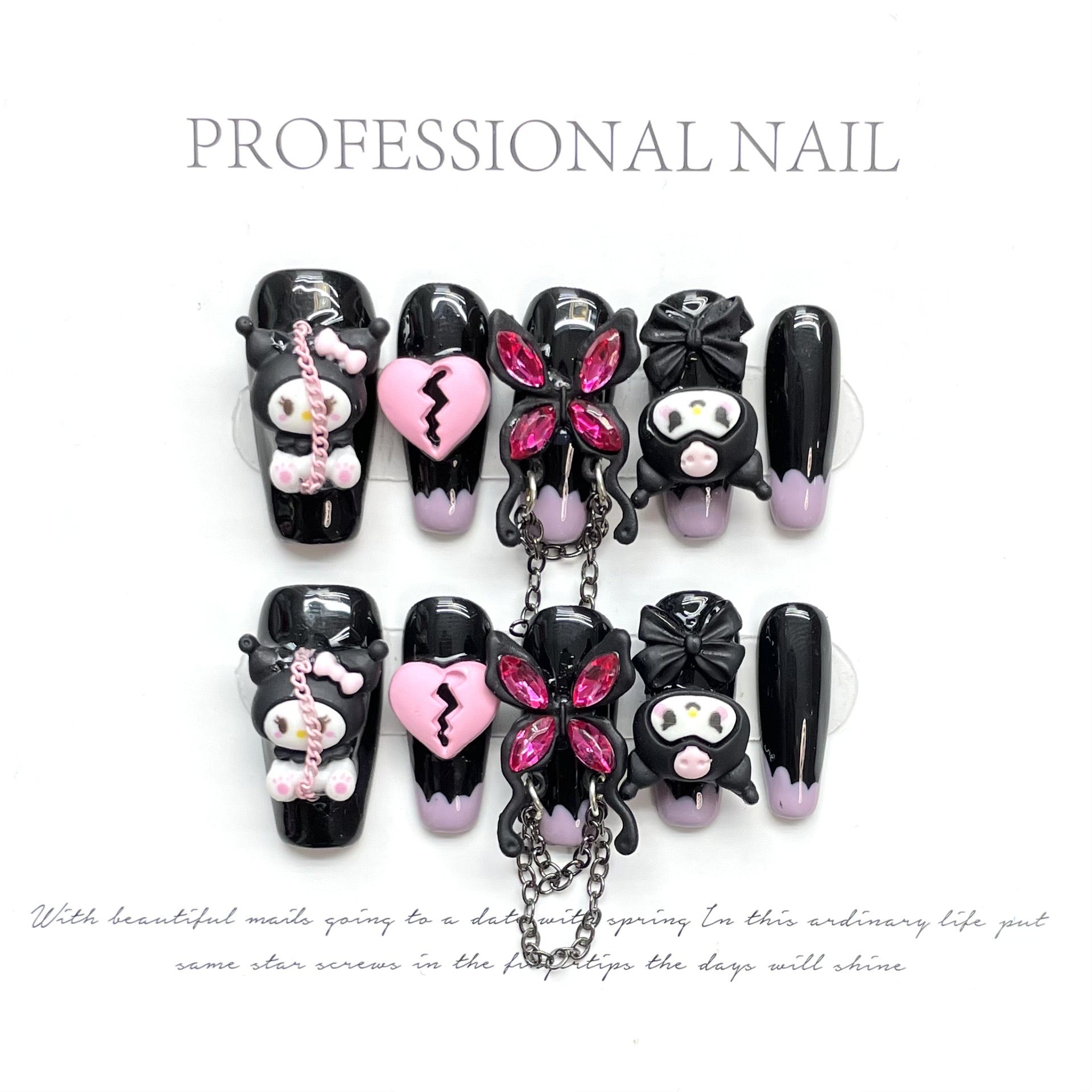 H311 Black KUKU Heart Pink Diamond Butterfly HANDMADE NAIL