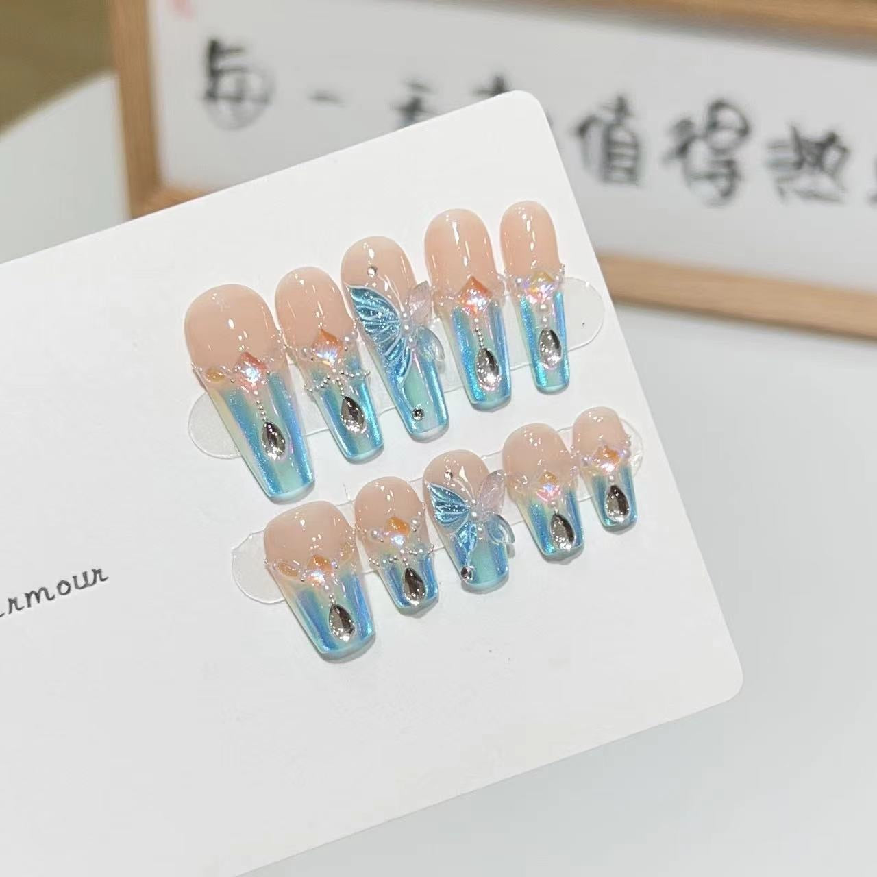 H34 Blue Blossoms Glazed Butterflies HANDMADE NAIL
