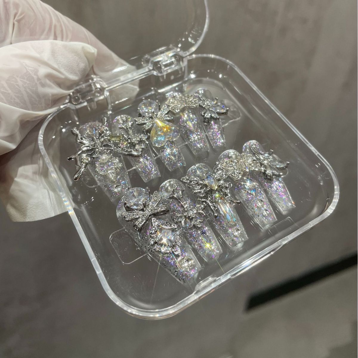 Each set has 10 pcs of Press-on nails and a Free application kit(Nail glue, Sticky tab, Nail file, and cuticle pusher).