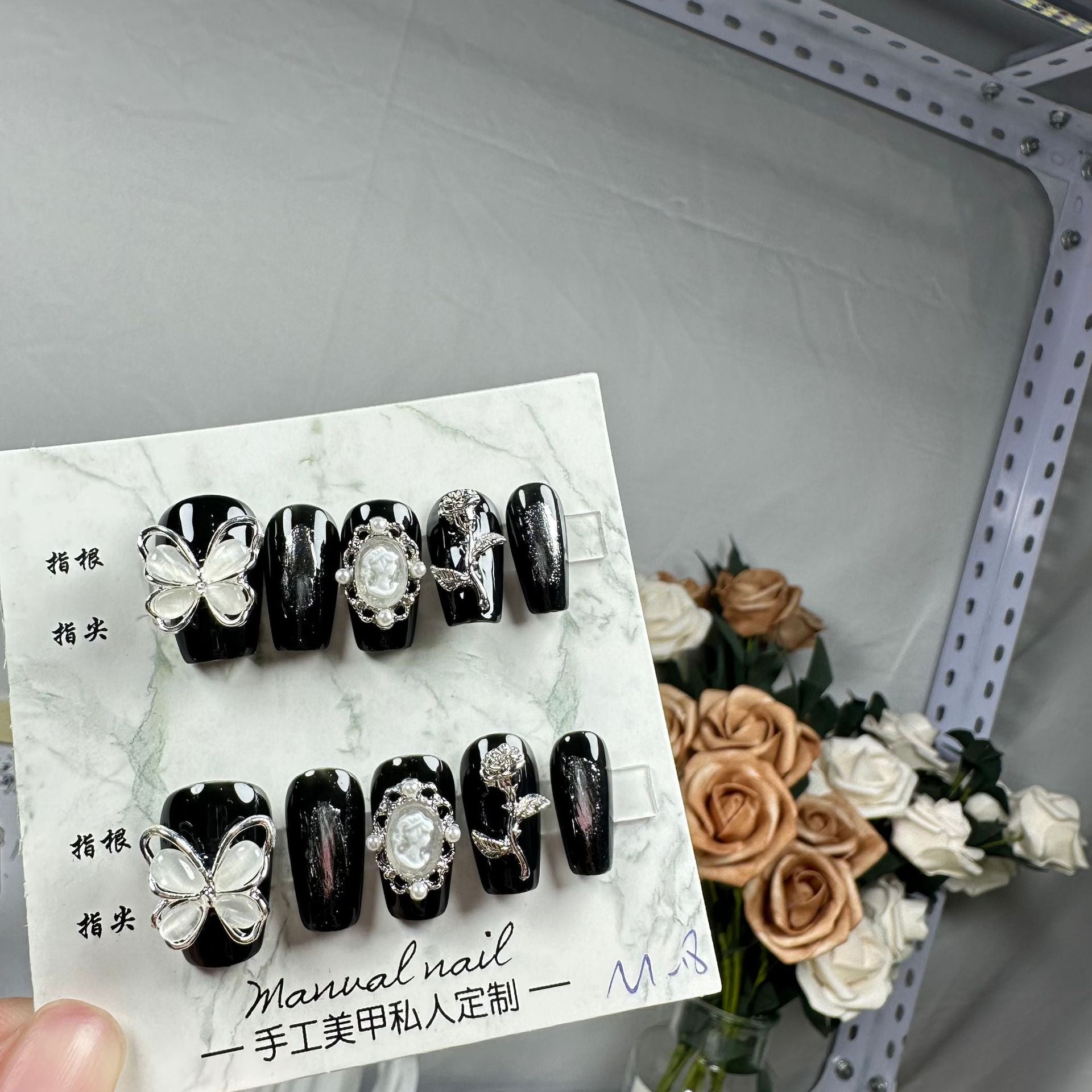 H63 DARK NIGHT BLACK BUTTERFLY PEARL HANDMADE NAIL