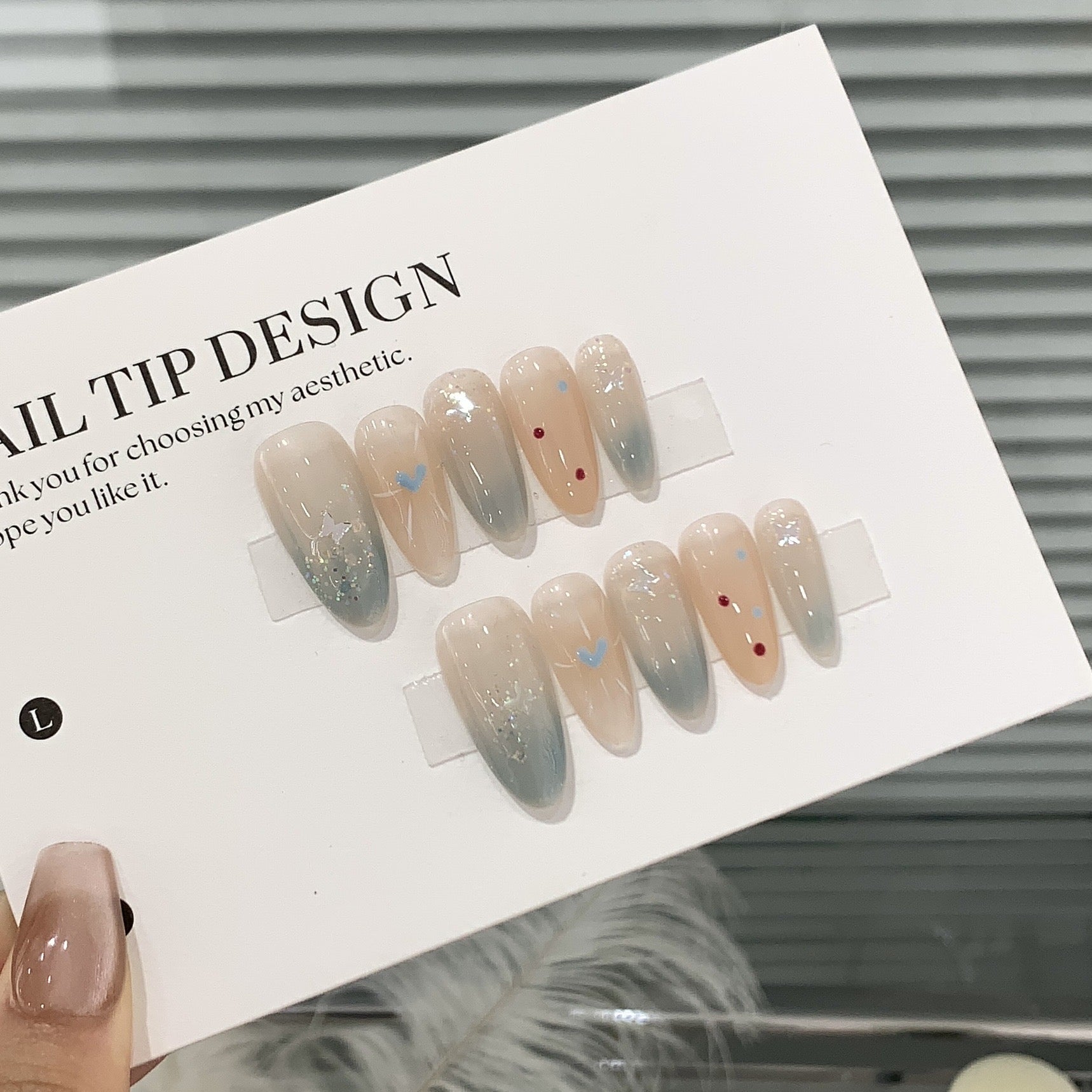 Each set has 10 pcs of Press-on nails and a Free application kit(Nail glue, Sticky tab, Nail file, and cuticle pusher).