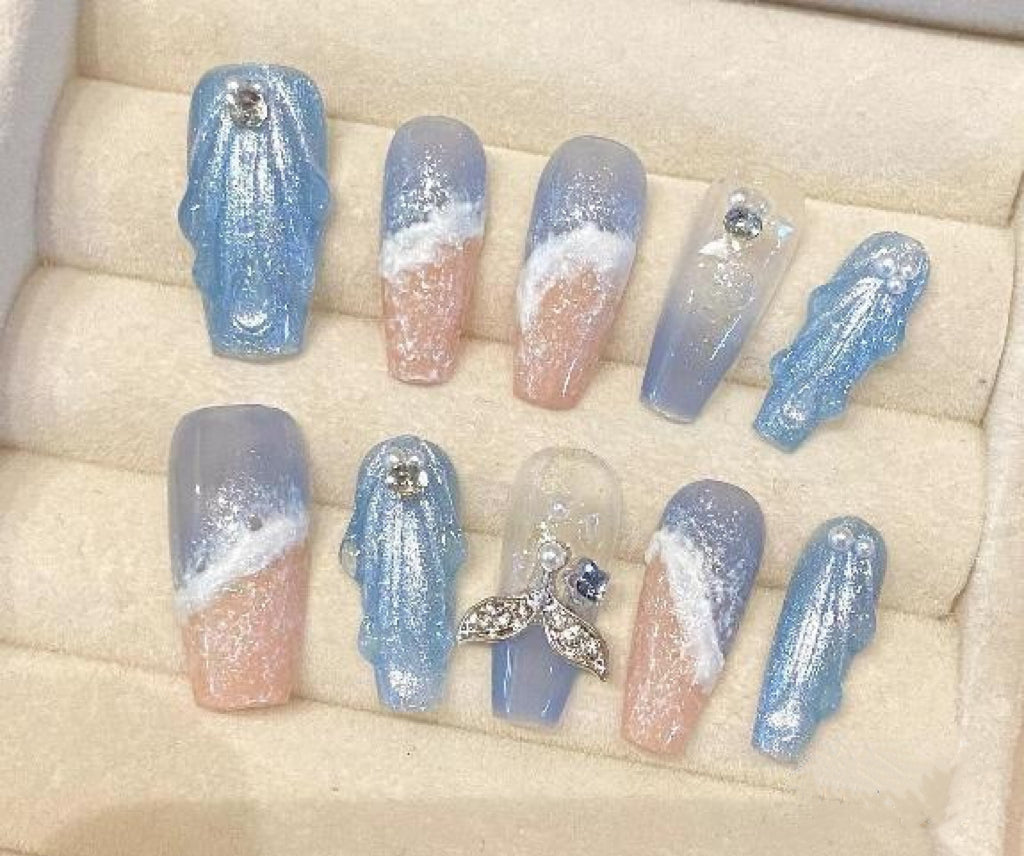 HML13 Ice crystal blue pearl spots HANDMADE NAIL