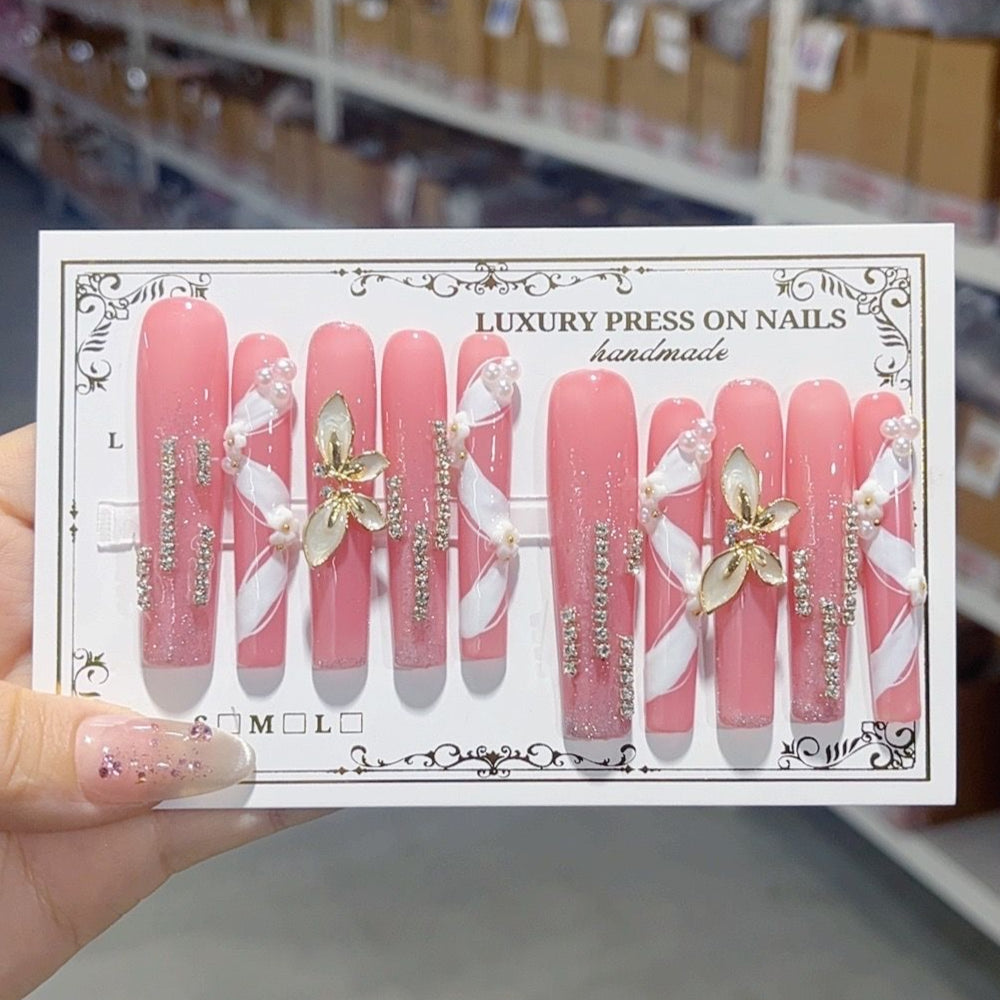 Each set has 10 pcs of Press-on nails and a Free application kit(Nail glue, Sticky tab, Nail file, and cuticle pusher).