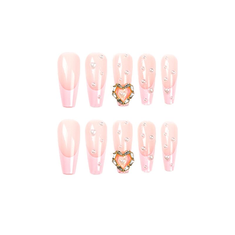 L48 sakura Pink Pearl Gold Heart LONG NAIL