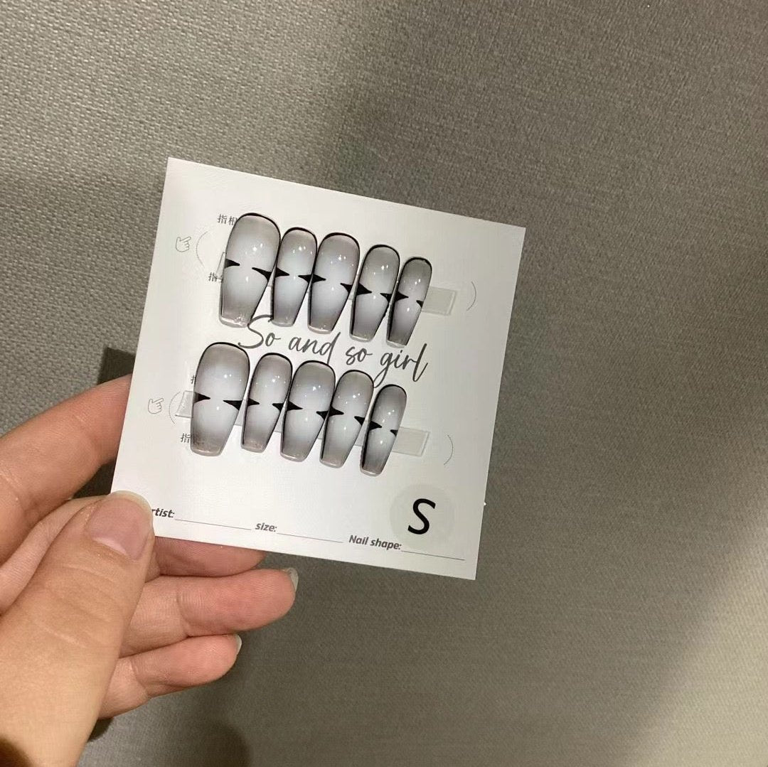 Each set has 10 pcs of Press-on nails and a Free application kit(Nail glue, Sticky tab, Nail file, and cuticle pusher).